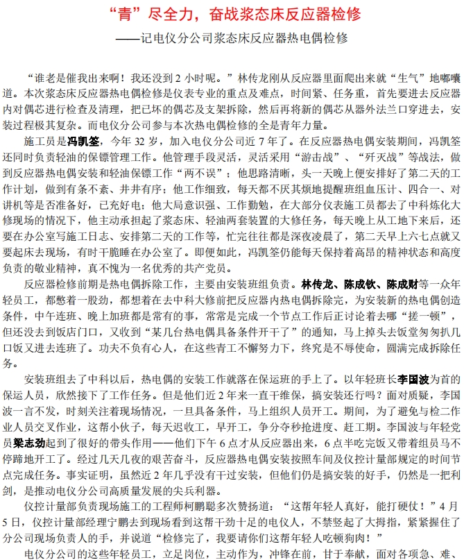 記電儀分公司漿態(tài)床反應(yīng)器熱電偶檢修