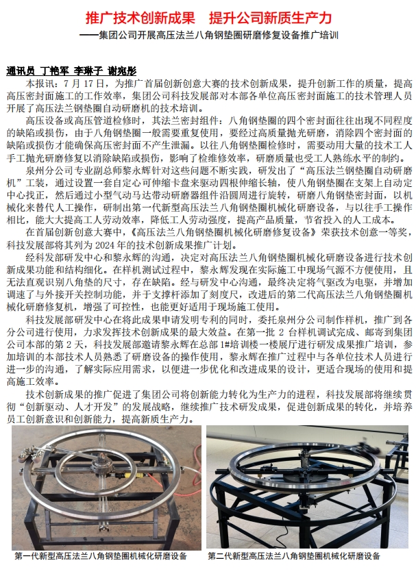 推廣技術(shù)創(chuàng)新成果 提升公司新質(zhì)生產(chǎn)力 ——集團(tuán)公司開展高壓法蘭八角鋼墊圈研磨修