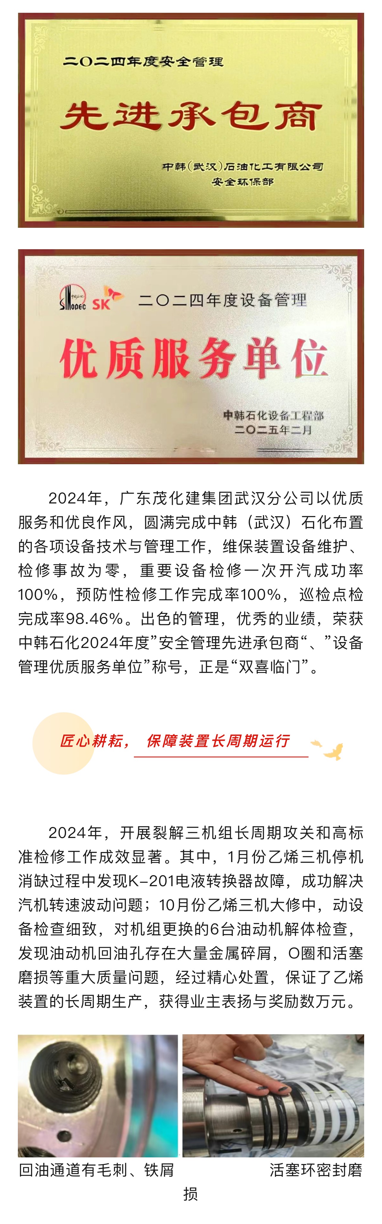 雙喜臨門 | 武漢分公司榮獲2024年度中韓石化“安全管理先進承包商”、“設備管