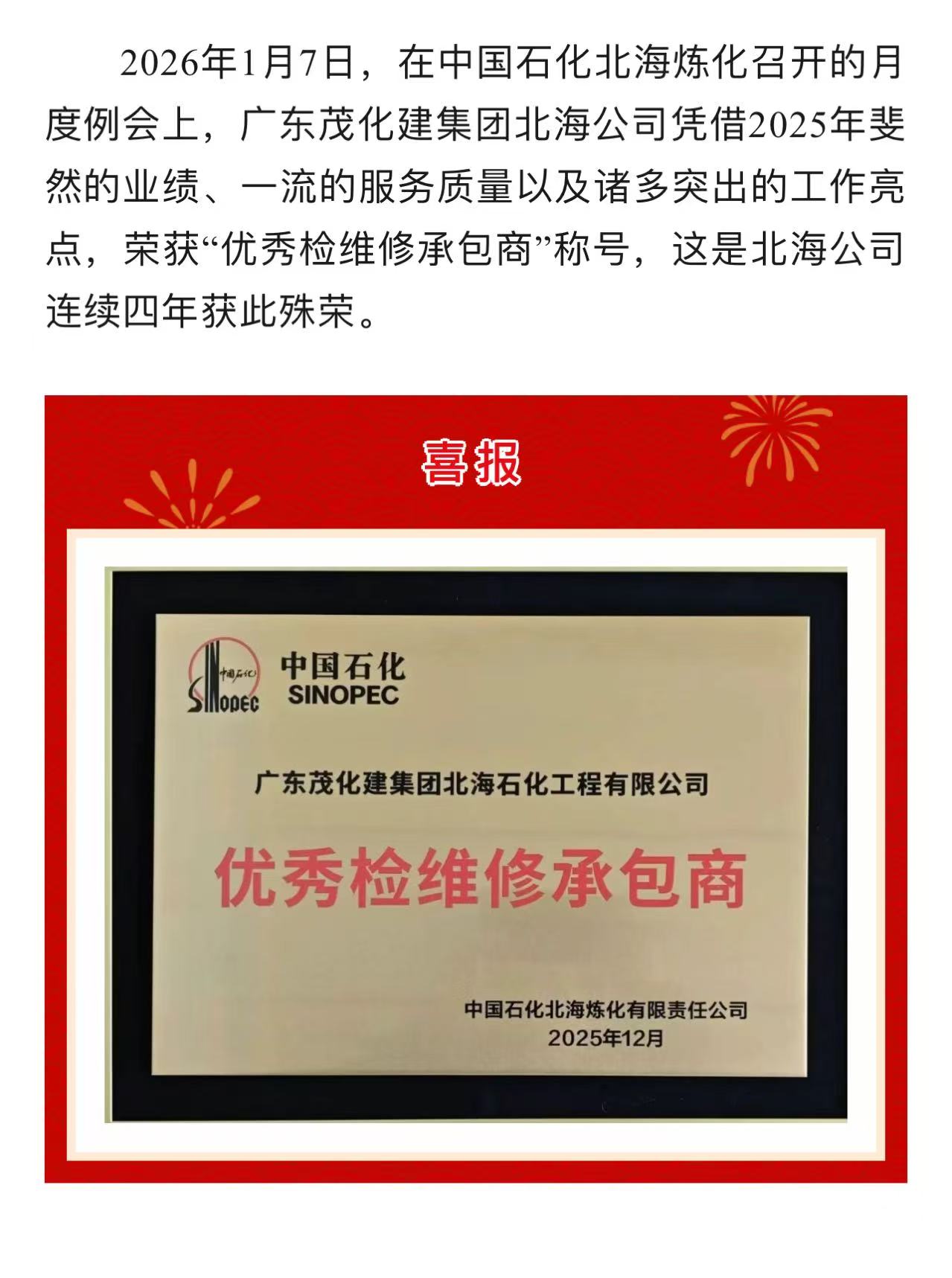 喜報(bào) | 廣東茂化建集團(tuán)北海公司榮獲2025年度“優(yōu)秀檢維修承包商”稱號