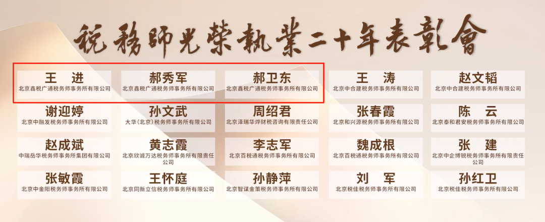 “稅務師光榮執業二十年表彰會”是對行業內有豐富經驗稅務師的嘉獎和鼓勵,公司是唯一有兩名代表上臺領獎的稅務師事務所,在倍感榮幸的同時,我們也將繼續秉承“專業、誠信、擔當”的執業理念,更好地服務廣大納稅人。榮譽不僅屬于個人,更屬于每一位深耕稅收事業的奮斗者,愿以此刻為起點,繼續做稅制改革的瞭望者,市場主體的守護者,經濟脈動的解碼者,在新時代的浪潮中以專業為帆,以合規為舵,續寫稅務師行業新的榮光。